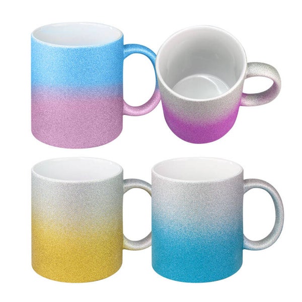 De plottiX 11oz glittermok met kleurverloop heeft een hoogwaardig glitteroppervlak dat perfect is voor sublimatie.